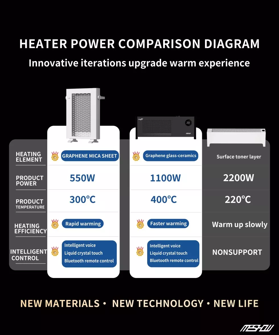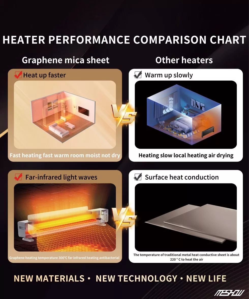 Jako profesjonalny dostawca w branży, Meshow opracował swój główny produkt - 1800 W biały grafene elektryczny grzejnik elektryczny. Ten grzejnik elektryczny grafenu wykorzystuje nową technologię grafenu, która ma bardzo wysoką przewodność cieplną i może szybko przekształcić energię elektryczną na energię cieplną. Może szybko się rozgrzać. Wytworzone światło na dalekiej podczerwieni jest pochłaniane przez ludzkie ciało, promując w ten sposób krążenie krwi i przyspieszając metabolizm.